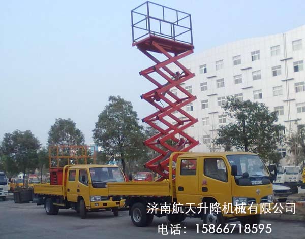 車載剪叉式升降機(jī)采用汽車、三輪車或電瓶車底盤做平臺(tái)底架,利用本車發(fā)動(dòng)機(jī)或直流電做動(dòng)力,既可行駛又可驅(qū)動(dòng)平臺(tái)升降。車載剪叉式高空作業(yè)平臺(tái)具有機(jī)動(dòng)性強(qiáng)、工作范圍較大等特點(diǎn)。特別適用于遠(yuǎn)距離、大范圍、不同工作場(chǎng)地的高空作業(yè),如公路交通、路燈照明、工程搶險(xiǎn)等。平臺(tái)動(dòng)力可使用汽車動(dòng)力或直流蓄電池,安全可靠。適用的車型有五十鈴、BJ1041、江淮(JAC)、依維柯、福田、東風(fēng)小霸王、時(shí)代小卡等輕型貨車及皮卡。