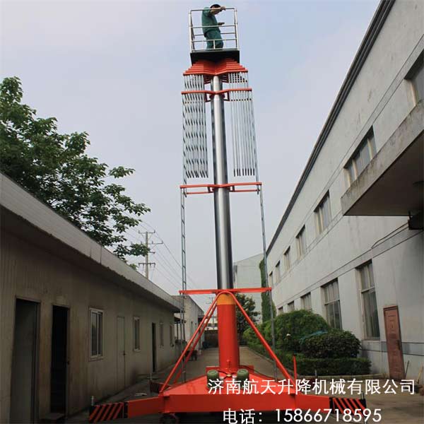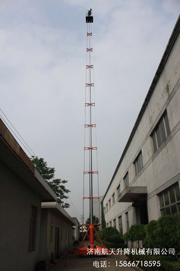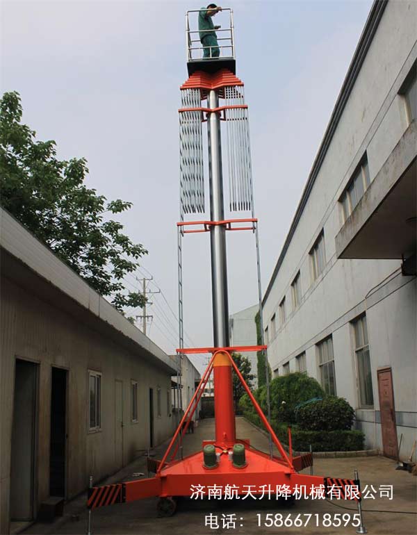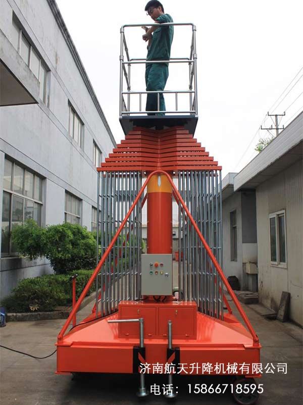 | 02 | 整機由平臺、伸縮油缸、單梯式或雙梯式防轉(zhuǎn)機構(gòu)、底盤油箱、支腿、行走輪等組成。 |